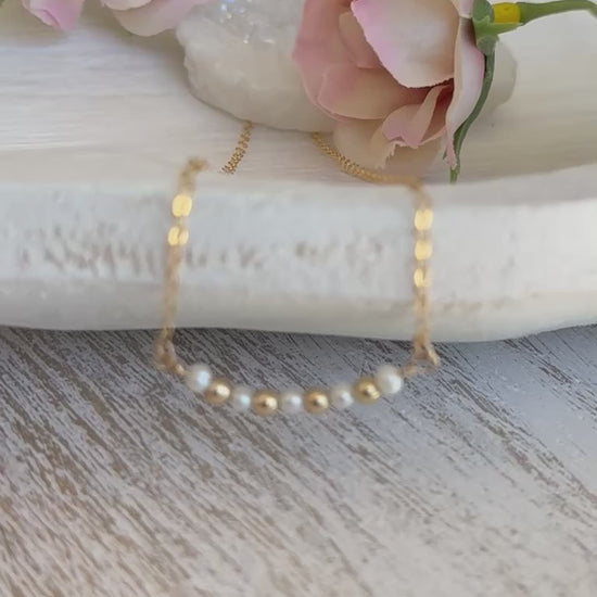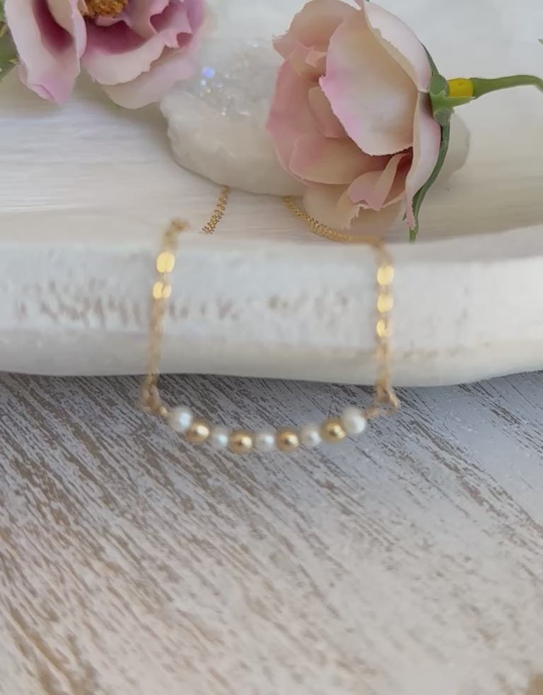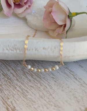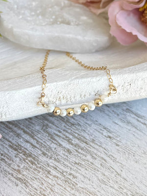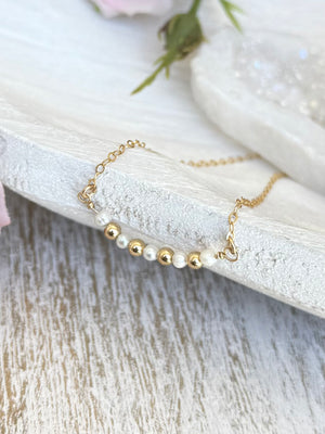 This simply stunning gold necklace, made with a delicate freshwater pearls and gold fill beads, are perfect for every day wear. High quality and dainty, they can be beautifully layered with our other necklaces